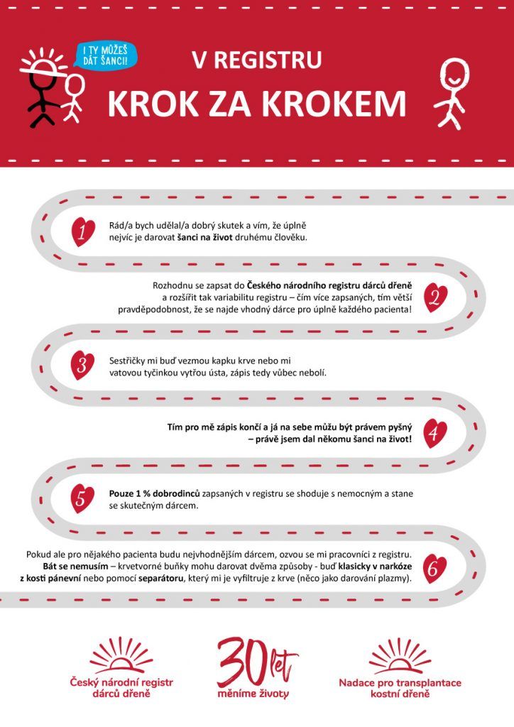 Český národní registr dárců dřeně (ČNRDD) a Nadace pro transplantace kostní dřeně (NTKD), dvě organizace a již třicet let jeden velký cíl – záchrana lidí včetně malých dětí, kteří onemocní leukémií, zhoubnými nádory, či těžkými útlumy krvetvorby a dalšími vážnými nemocemi, které jsou léčitelné pouze transplantací kostní dřeně. V rámci rodiny svého dárce bohužel nalezne jen asi čtvrtina pacientů, všichni ostatní jsou odkázáni na dobrovolného dárce zapsaného v registru. Cílem ČNRDD je proto neustále rozšiřovat databázi dobrovolníků o nové mladé a zdravé jedince, a to za finanční podpory NTKD, která program dárcovství kostní dřeně každoročně financuje.