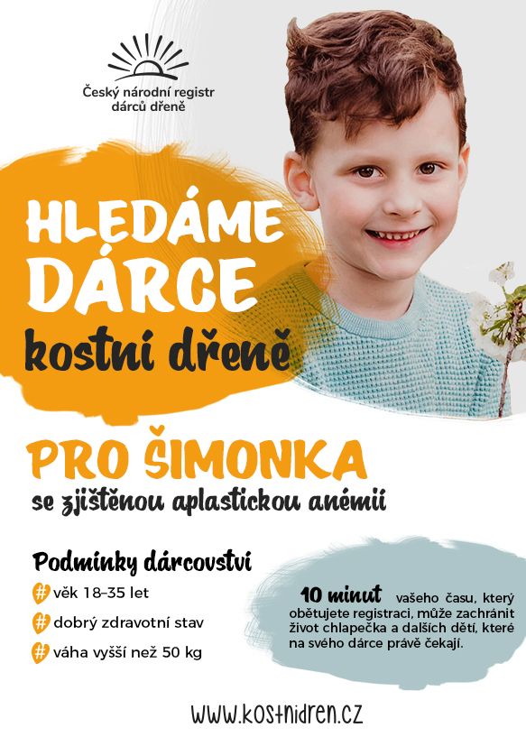 Aktuálně sháníme vhodného dárce kostní dřeně pro malého Šimonka. “Život nám do cesty postavil tvrdou zkoušku. U Šimonka se zjistila aplastická anémie. Hledáme vhodného dárce pro našeho milovaného chlapečka. Pomozte nám ho najít, prosím”, píše maminka Kristýna z Babic u Uherského Hradiště.