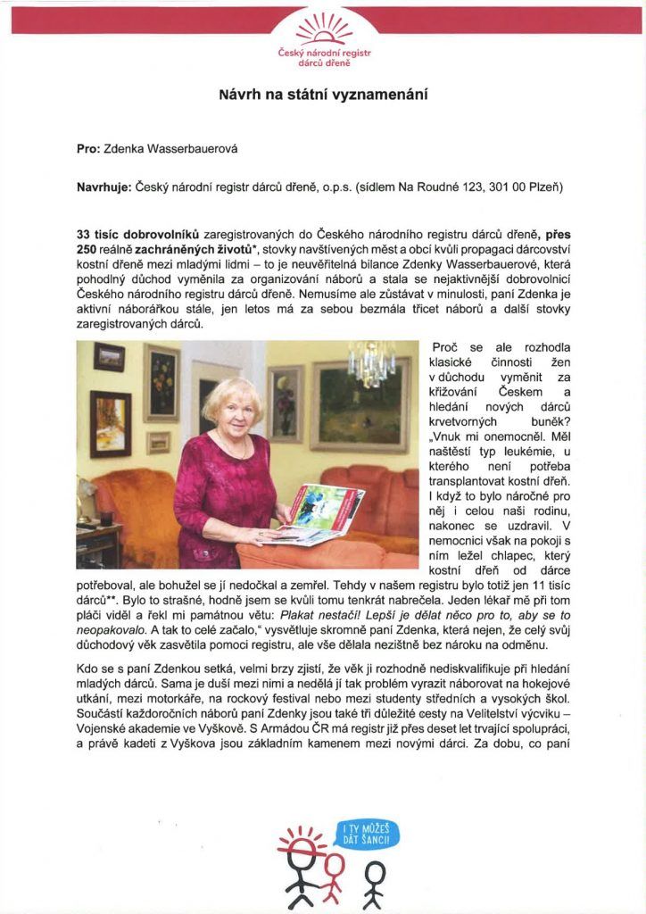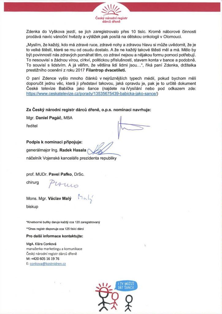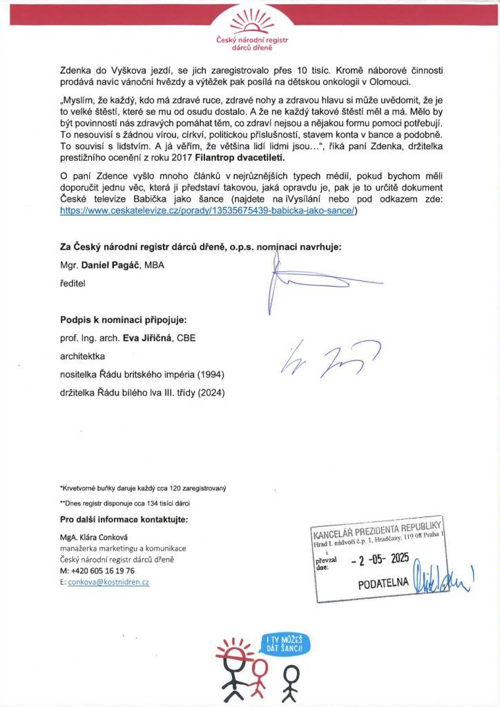 Za Český národní registr dárců dřeně, o.p.s. nominaci navrhuje:
