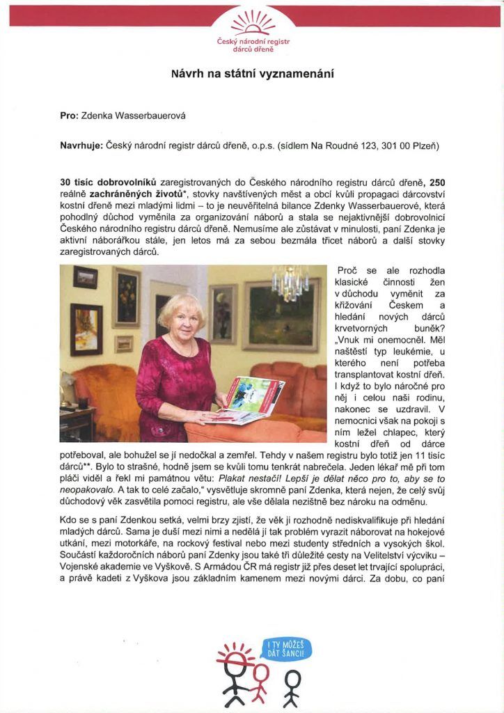 33 tisíc dobrovolníků zaregistrovaných do Českého národního registru dárců dřeně, přes 250 reálně zachráněných životů*, stovky navštívených měst a obcí kvůli propagaci dárcovství kostní dřeně mezi mladými lidmi – to je neuvěřitelná bilance Zdenky Wasserbauerové, která pohodlný důchod vyměnila za organizování náborů a stala se nejaktivnější dobrovolnicí Českého národního registru dárců dřeně. Nemusíme ale zůstávat v minulosti, paní Zdenka je aktivní náborářkou stále, jen letos má za sebou bezmála třicet náborů a další stovky zaregistrovaných dárců.