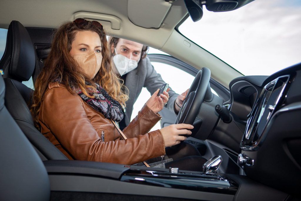 Pavel Kunčík (bílá rouška), Consumer Experience Director, předává Volvo V60 T6 Recharge Kláře Conkové, manažerce marketingu a komunikace a Stanislavu Chmelovi, náboráři, z Českého národního registru dárců dřeně